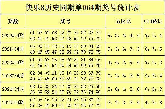 第5-8位号码分析:历史同时第064期出现限制在12-32区段,号码012路比为11:7:6,旧年同时开出奖号:22+24+25+29,号码012路比为1:2:1。