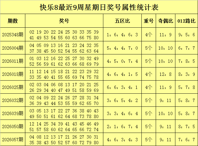 福彩欢悦8第2026057期(上周日)奖号纪念:04 08 12 13 17 21 26 27 30 31 35 38 43 50 52 57 60 72 79 80,其中奖号奇偶比为9:11,五区比为4:6:3:4:3,012路比为7:6:7,包含5个重号12、43、57、60、72。